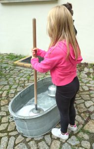 Im Workshop erkunden die Kinder die hygienischen Gewohnheiten im Laufe der Geschichte und erfahren, wie Wäsche früher gewaschen wurde. Noch vor 50 Jahren war das eine harte Arbeit, die oft nur von Frauen erledigt wurde. Die Kinder haben die Möglichkeit, selbst auszuprobieren, wie sich diese Arbeit angefühlt hat. Anschließend können sie mit Naturmaterialien und Farben ihre eigene Seife herstellen und mit nach Hause nehmen.